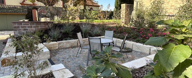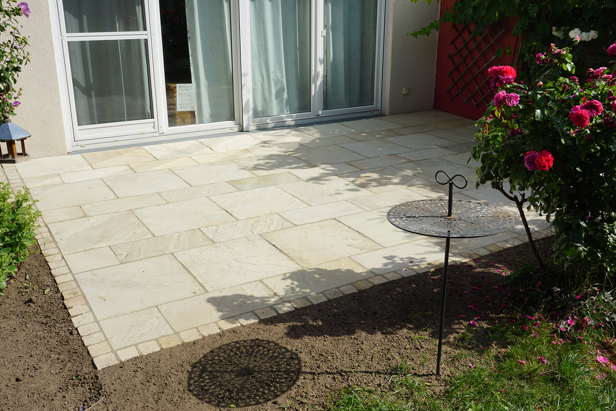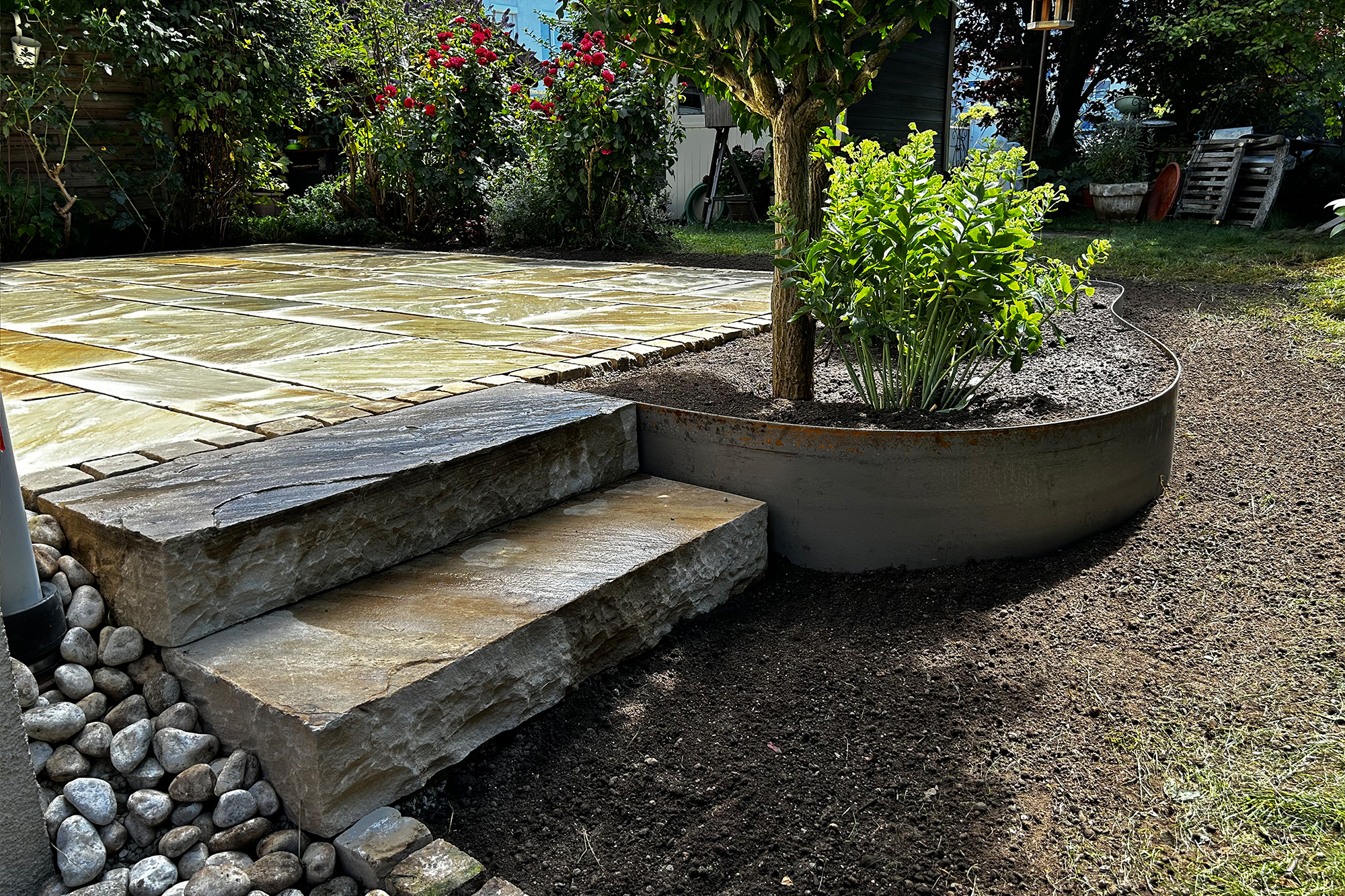 Die Terrasse erhielt einen stilvollen Rahmen, bestehend aus einem einzeiligen Kleinpflasterband. Ein vorhandenes Beet wurde mit einem flexiblen Cortenstahlband in organischer Form neu eingefasst.