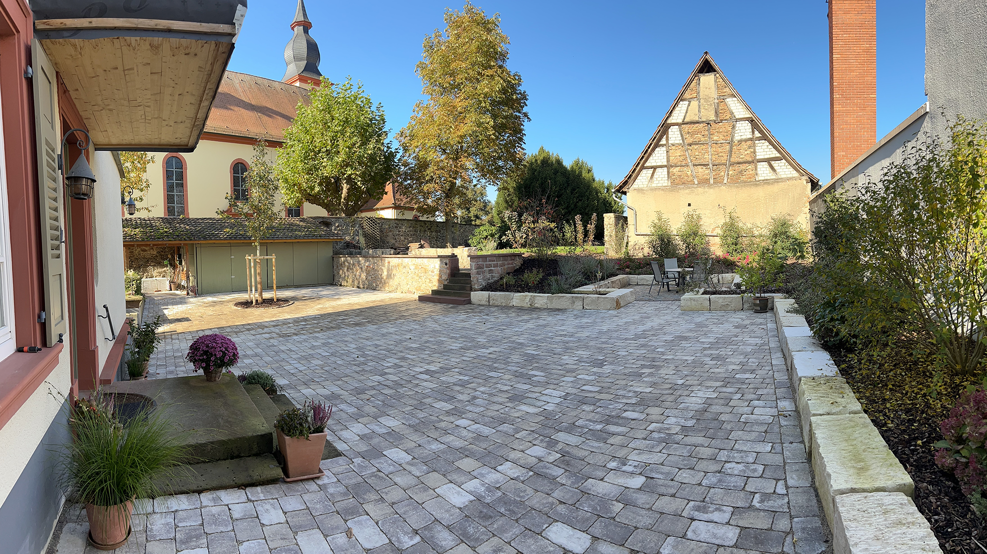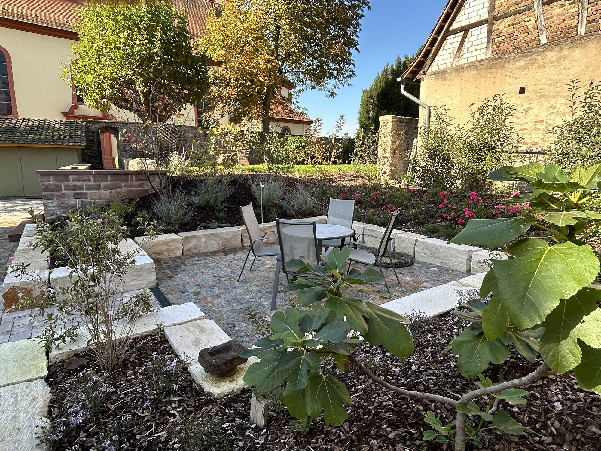 Das Besondere: Der Bodenbelag aus Natursteinpflaster in ungebundener Bauweise wurde mit Steinen erstellt, die bei Aushubarbeiten auf dem Gelände zum Vorschein kamen.