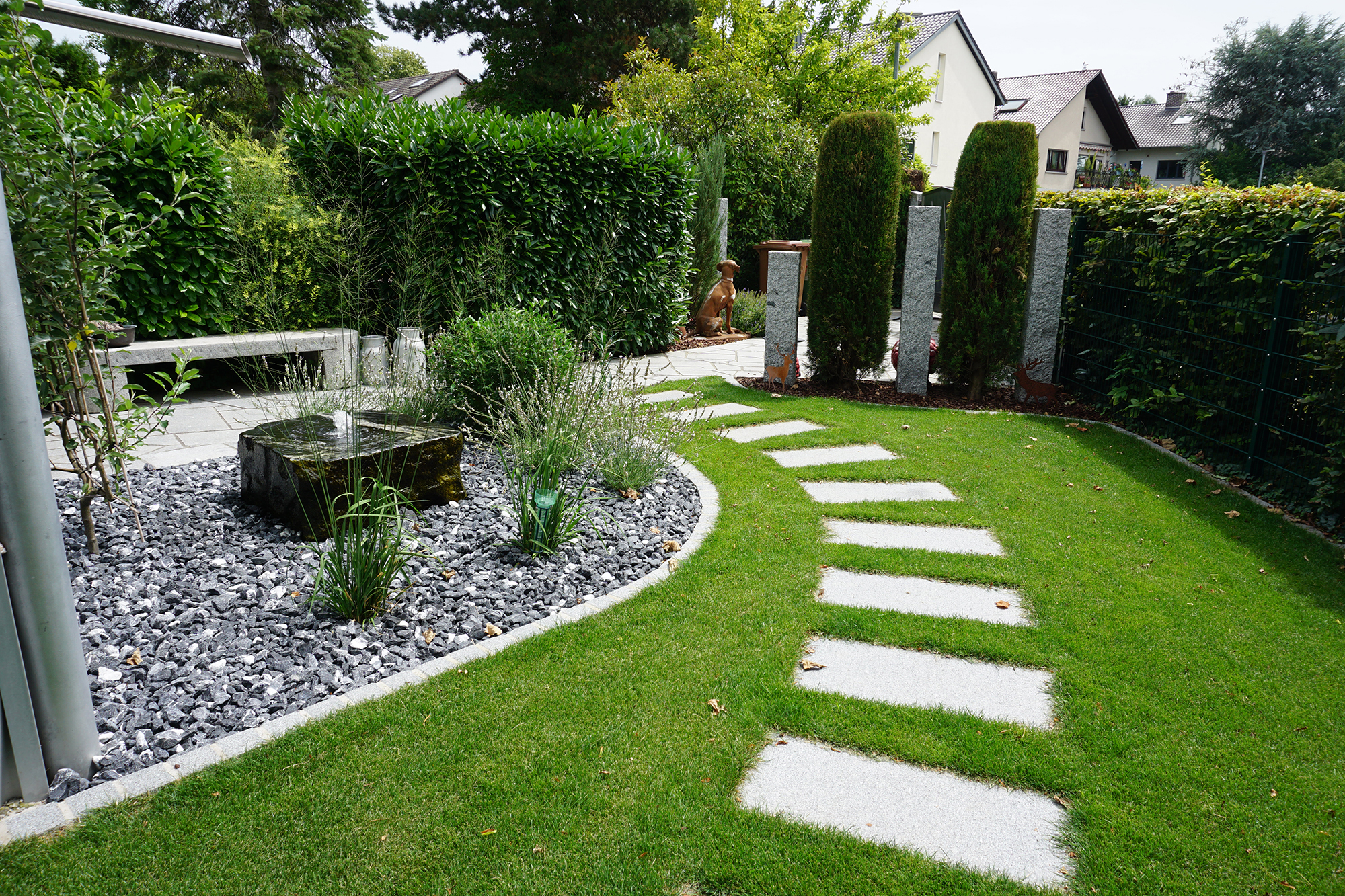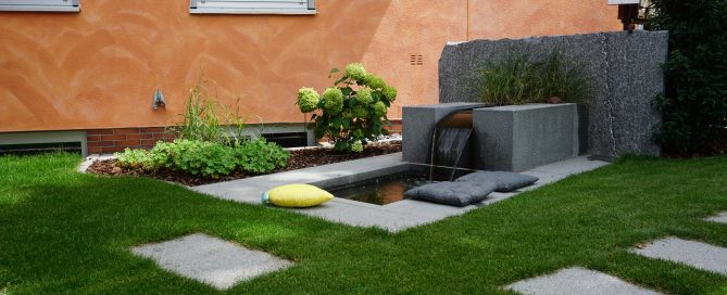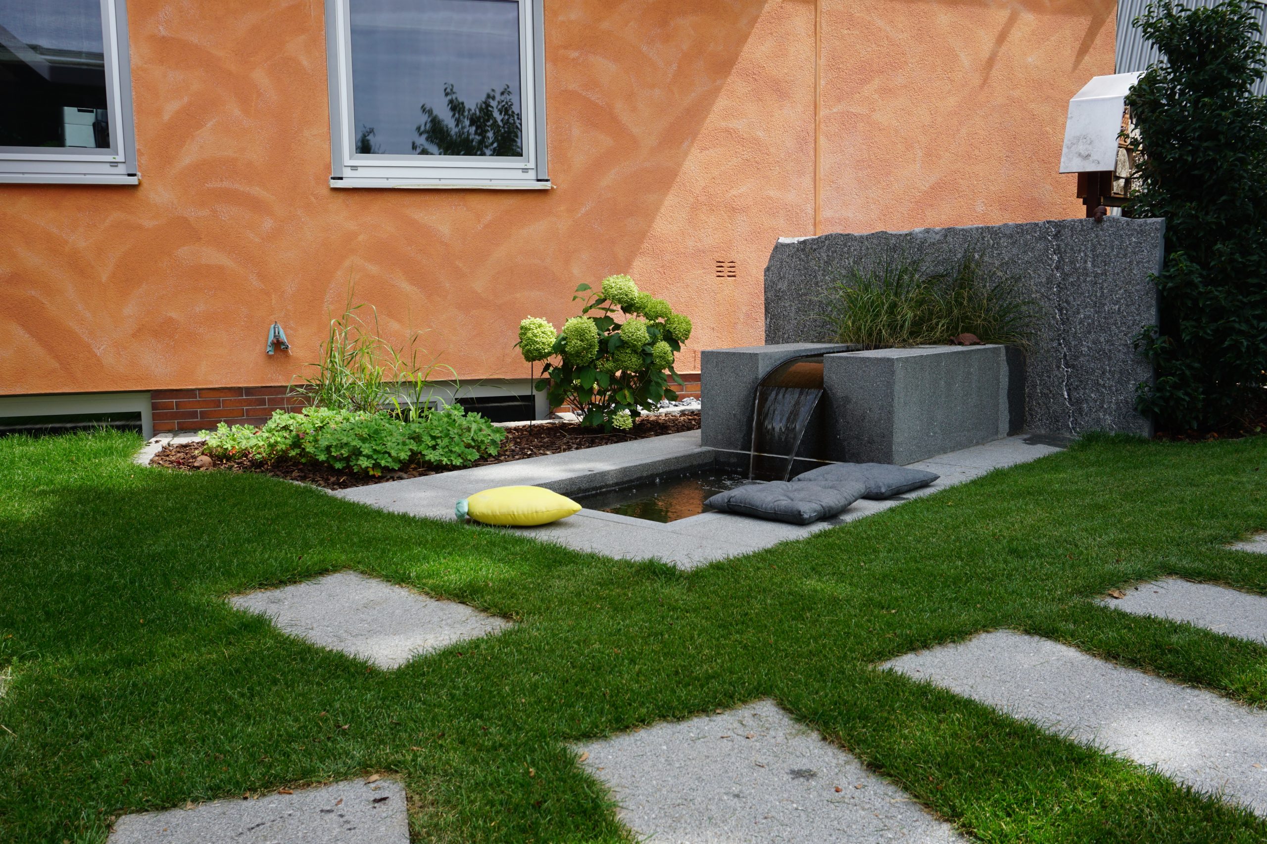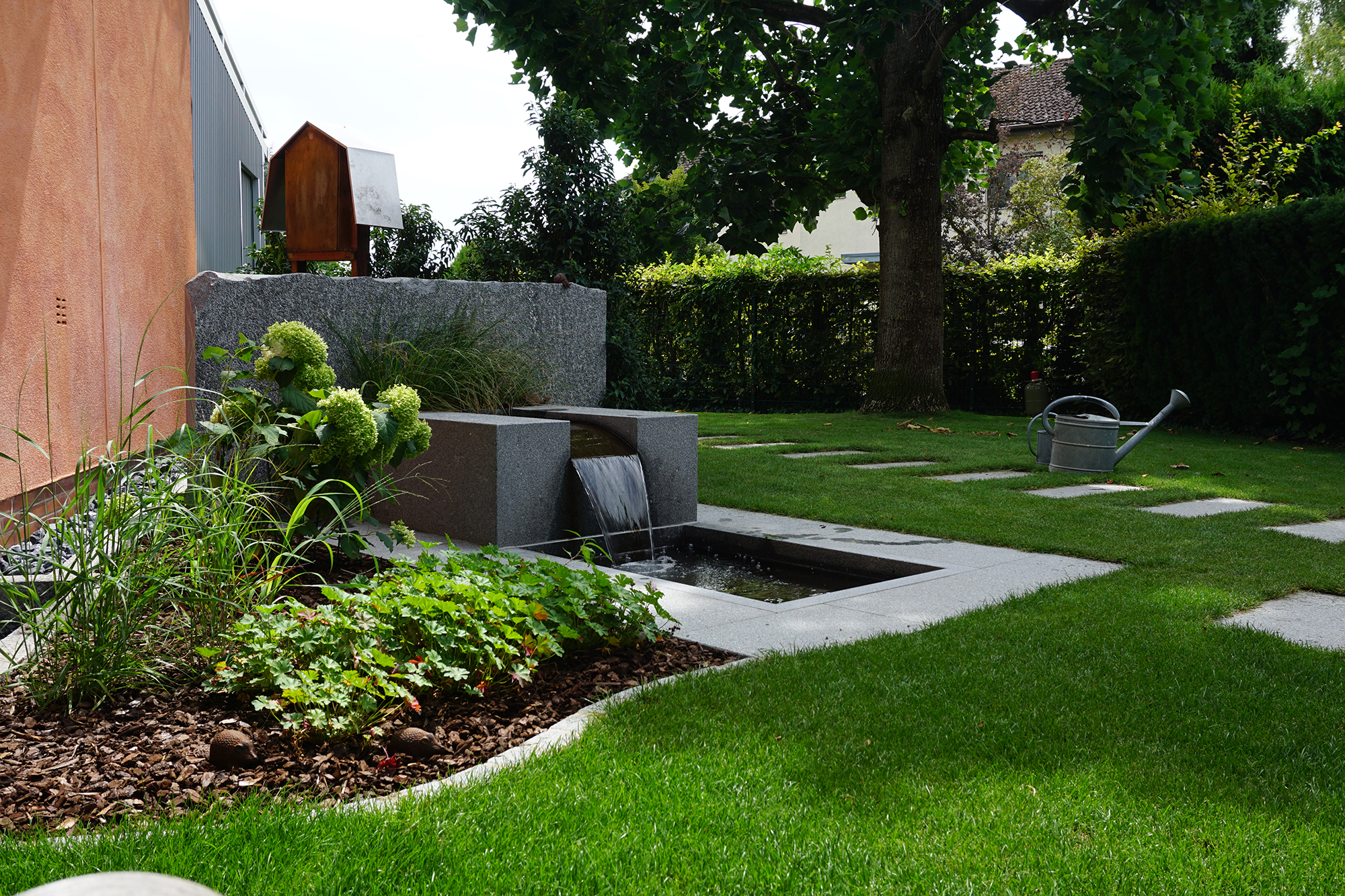 Die Kombination aus Quellblock, Wasserbecken und Trittplatten bildet das Grundgerüst dieser modernen Wasseranlage. Die Becken­tiefe lädt zum Füße­kühlen ein. Alle Elemente bestehen aus dem Naturstein Diorit in der Ausführung Negro Nacional der Firma Krauss der Stein — ein besonders abriebfester und kratzunempfindlicher Stein aus Portugal.