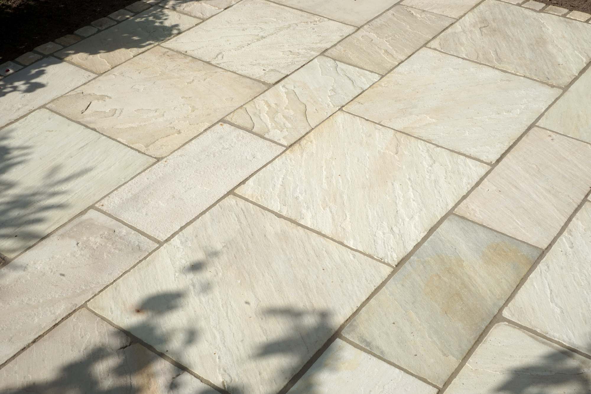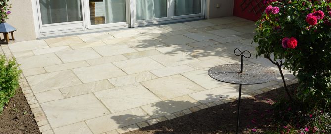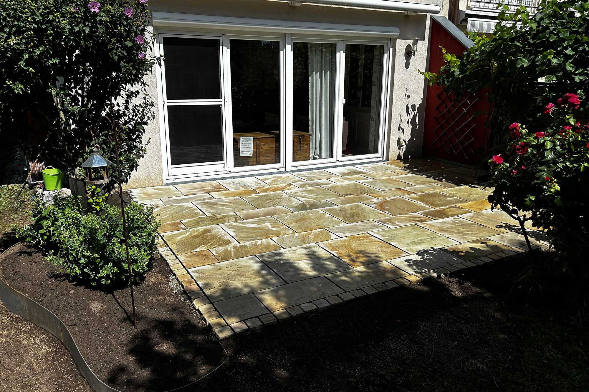 Die oberflächlich patinierten und handbekanteten Natursteinplatten wurden in gebundener Bauweise verlegt. In diesem Fall bedeutet das: Drainagebeton als Tragschicht, eine Haftbrücke zur festen Verklebung der Platten sowie der Einsatz von zweikomponentigem Fugenmörtel für die dauerhafte Verfugung.