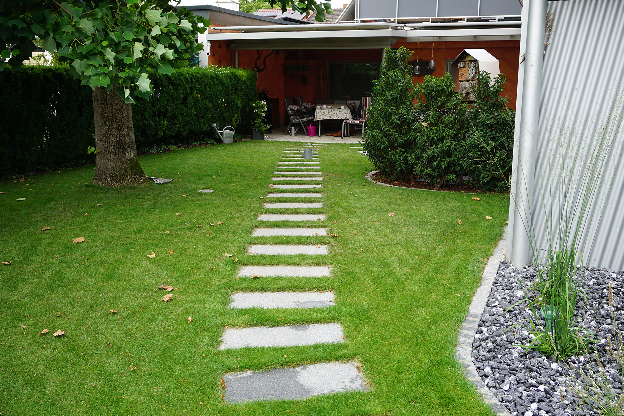 Eine alte Bestandstreppe wich zwei neuen Massivblockstufen, die einen harmonischen Zugang zur Terrasse im Einklang mit den verwendeten Materialien schaffen.